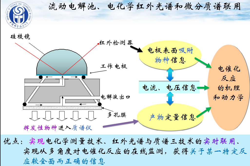 3、成功地实现了利用电化学原位红外光谱技术(ATR-FTIRS)确定复杂电催化反应关键中间步骤的反应动力学(Ref),建立了可定量测量复杂反应产物的生成速率的电化学微分质谱(DEMS)技术(ref)。