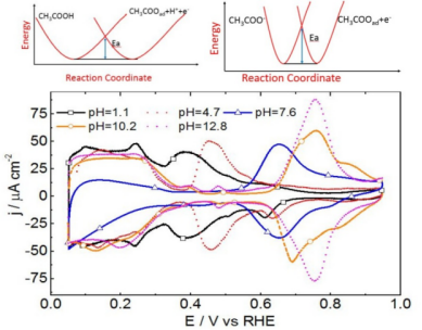 近日中国科学技术大学合肥微尺度物质科学国家实验室和化学物理系的陈艳霞教授课题组在系统探究究了醋酸在模型单晶电极Pt(111)上吸附的pH效应后,发现阴离子的吸附电位随着pH增加正移而吸附速率降低. 他们证实前者是由于电化学吸附过程的平衡电位移动所致,并非之前常被误的吸附“减弱”现象, 即不对应着通常认为的吸附作用能降低。而酸性介质中吸附速率高于碱性介质, 则是由于质子的参与或中性分子去溶剂化的吸附过程能垒较无质子参与过程或者包含阴离子去溶剂化过程较低所致。该研究进展纠正了对电催化体系中阴离子吸附pH效应的认识,也为正确理解溶液组成对催化活性的影响提供了依据.